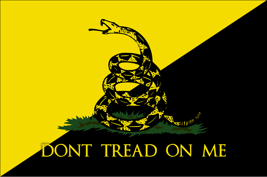 La bandera libertaria con la serpiente y el lema «Don’t Tread on Me» es un símbolo reconocido del movimiento libertario en Estados Unidos. Destaca la libertad individual y la resistencia contra la opresión del gobierno.