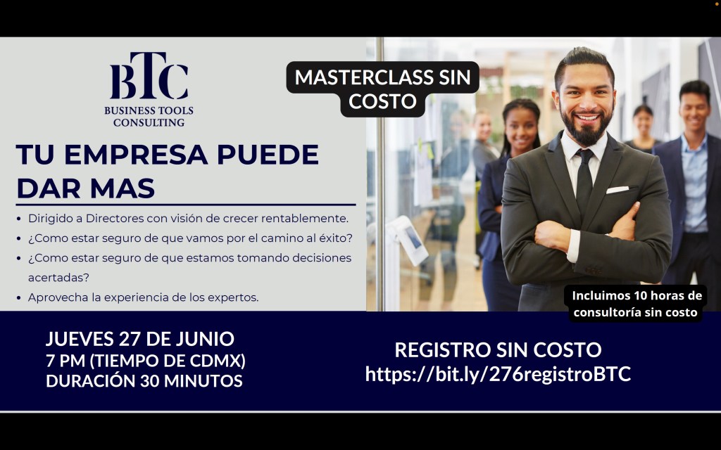 En Business Tools Consulting (BTC), sabemos que liderar una empresa no es tarea fácil. Por eso, hemos creado una Masterclass gratuita especialmente dirigida a directores con visión de crecimiento rentable. Nuestro objetivo es proporcionarte las herramientas y conocimientos necesarios para potenciar tu empresa y llevarla al siguiente nivel.